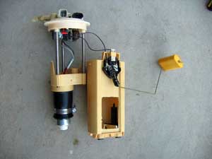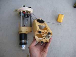 Now to remove the pump disconnect the lines and use a large flathead screwdriver and hammer and pound the retaining ring off counterclockwise. It does take quite a bit of pounding to rotate that ring to the unlocked position. Then just pull the pump out and be careful not to catch the float when you pull it out. After it is out you need to disassemble it. There are two fuel lines that come from the pump and you can just cut them as you won't be reusing them with the new pump. Then just push in the two retainer tabs from the outside bucket and pull it apart being careful not to pull the wires off the fuel level sender. Below is what it should look similar to at this point.
