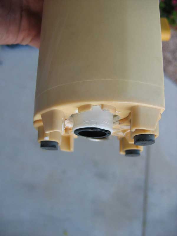 Now try and put the pump back together carefully squeezing the upper assembly together since it is spring loaded. You will have to bend the fuel line to get it to compress enough to get the upper assembly back into the bucket. You want the bottom of the pump to be resting on the bottom of the bucket and have the pickup of the pump sticking through to the underside of the bucket. There may be a few ridges on the inside of the pump bucket that you can shave down with a dremel so the pump rests flatly on the bottom of the bucket.
